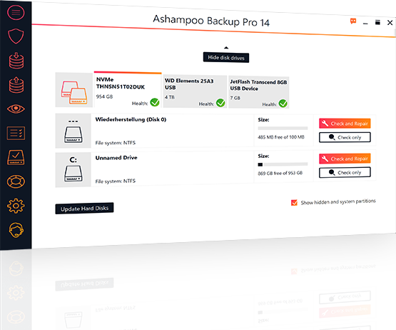 The program also features an additional drive / partition check that analyzes and repairs individual sectors. Whether internal or external, Ashampoo® Backup Pro 15 takes extra good care of your hard disks!