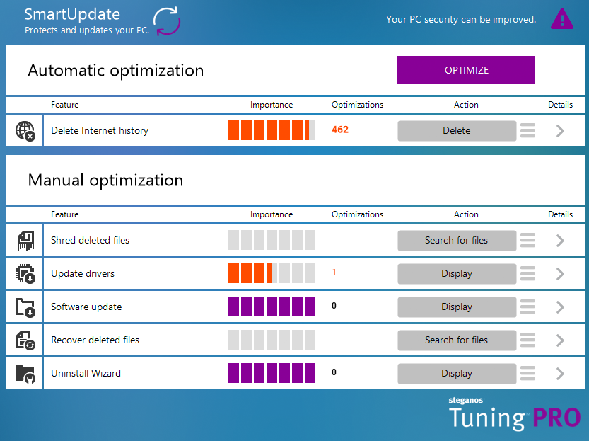 Steganos Tuning PRO closes security holes by providing the latest patches and updates for your programs. The automatic download of drivers leads to maximised speed and reliability (ATI, NVIDIA, Intel, etc.).